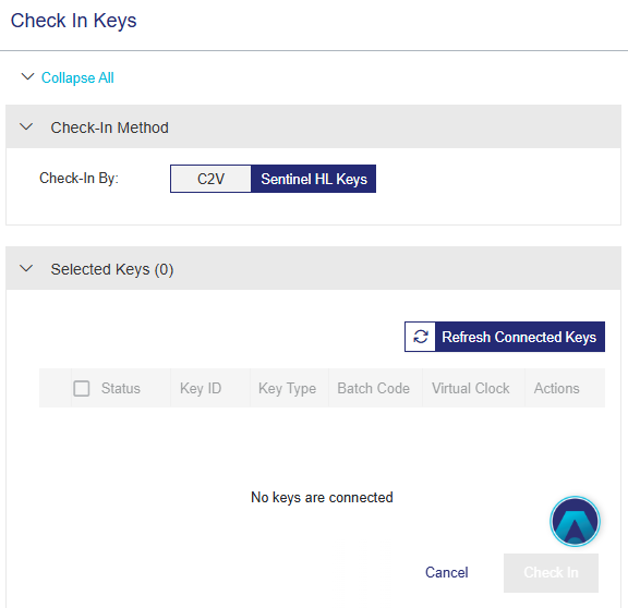 •If you selected Sentinel HL Keys: From the list of keys, select the check box next to each key to check in.