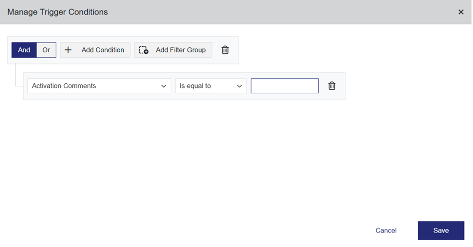 Click the Manage Trigger Conditions button next to Trigger Conditions to open the following dialog box: