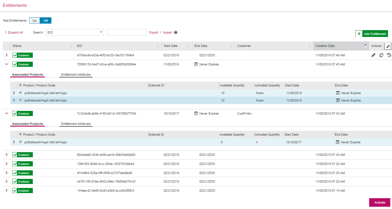 >The Activation button appears at the bottom of the screen. You can select multiple line items across entitlements and then click the Activation button to activate multiple entitlements.