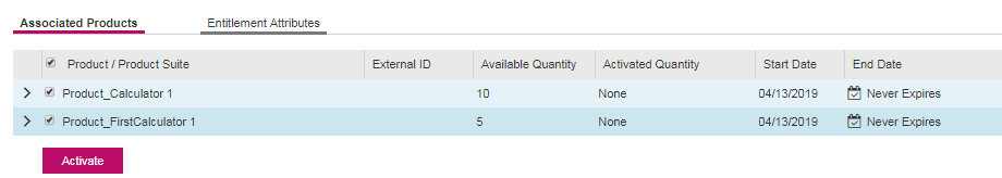 > On the Entitlements page, expand an entitlement and under Associated Products, select check boxes for the line items that you want to activate. An entitlement with multiple line items selected for activation is displayed below: