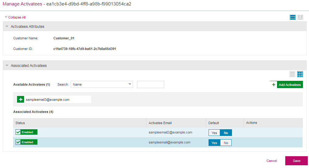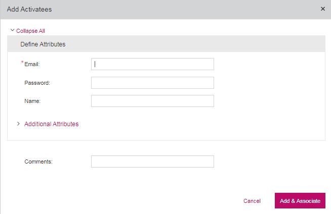 The Add Activatees button on the Manage Activatees page is used for adding and associating an activatee. The page to add and associate an activatee is given below: