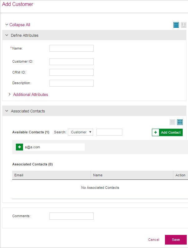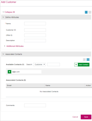 After providing the attribute details, use the Associate Contacts pane displayed below to associate contacts with the customer you are creating.