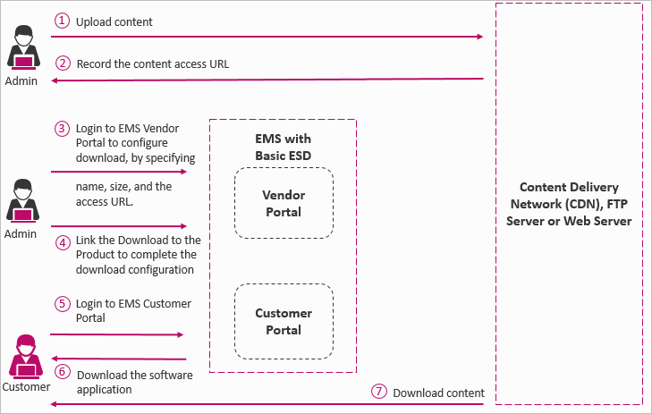 Interface to associate content download links with specific products. Software vendor is responsible for uploading the content to a FTP server, web server, or a content delivery network (CDN).
