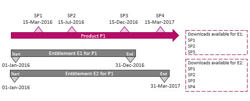 In this scenario, downloads will be available in the following manner: >For entitlement E1, the service packs SP1, SP2, and SP3 will be available for download, as the release dates of these service packs fall between the start and end date of the line item P1. >For entitlement E1, the service pack SP4 will not be available to the customers, as the release date of SP4 is greater than the end date of the line item P1. >Entitlement E2 provides access to SP1, SP2, SP3, and SP4. |