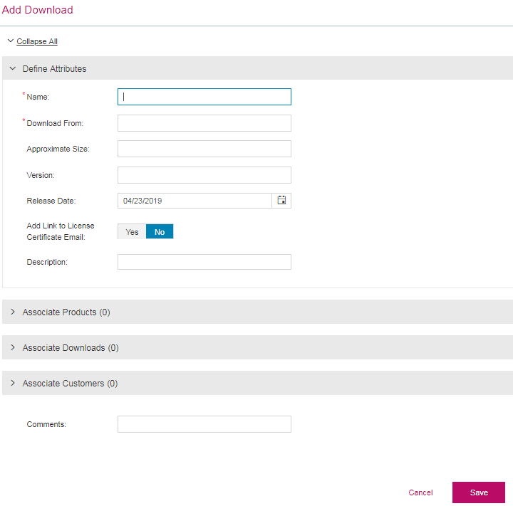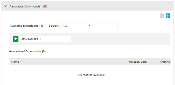 After associating products, use the Associate Downloads pane displayed below to add associated downloads.