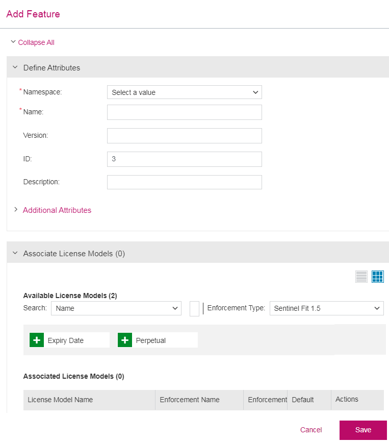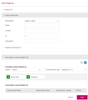 After providing the attribute details, use the Associate License Models pane displayed below to associate license models with the feature you are creating.
