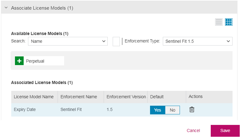 >If multiple license models are associated with a feature, you must mark one of them default by setting the Default toggle button to "Yes".