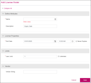 3. In the Add License Model page that opens, enter the license model Name and Description. For more information on these attributes, see Common License Model Attributes.