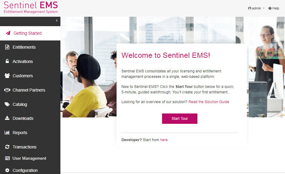 >REST API Guide: The "Developer? Start from here" link references Sentinel EMS REST API Guide. This document provides information about the REST API components exposed to facilitate integration of Sentinel EMS with external CRM and ERP systems.