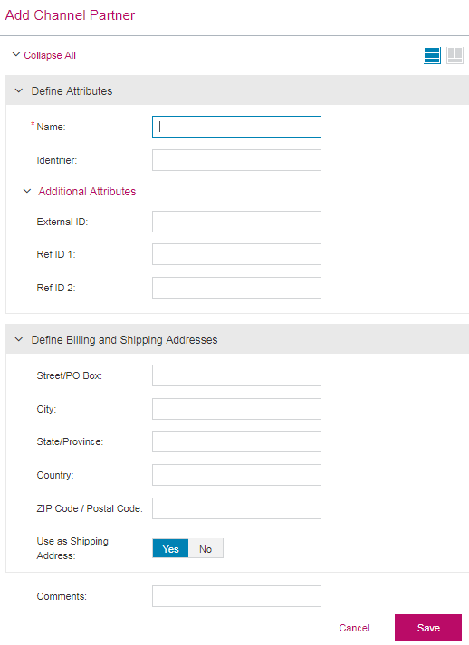 | External ID | External reference identifier that identifies the channel partner in an external system. | Optional |