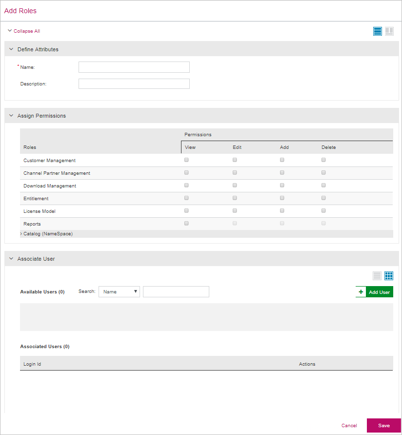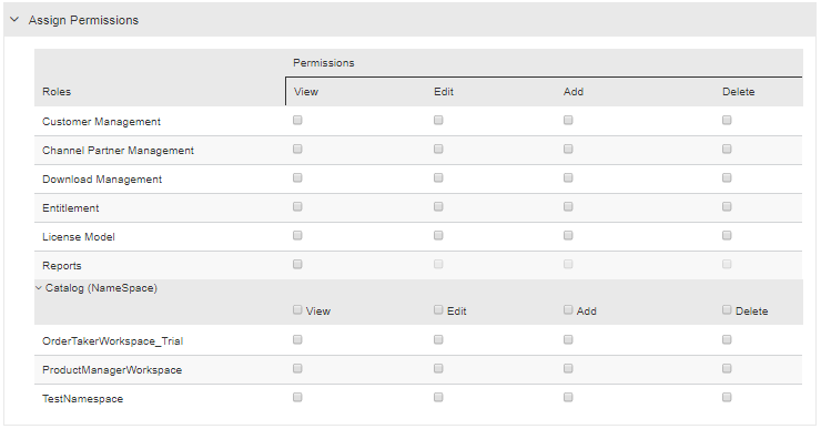 •The entity level permissions provided for entities such as, Entitlement, License Model, Customer Management, and Download Management. You can assign View, Edit, Add, and Delete permissions to these entities.