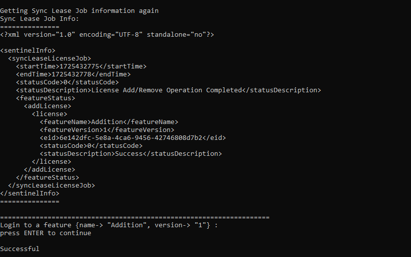 4.Press Enter to call the login API. This requests licenses for the feature you created.