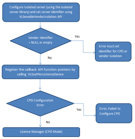 This section highlights the required steps for enabling custom persistence device feature for a License Manager. This feature is available for isolated License Managers only. Developers need to implement custom persistent device feature as a part of the isolated License Manager library API VLSenableVendorIsolation. Refer to the "Chapter - Vendor Isolation of the Sentinel RMS SDK Developer Guide to learn more about the isolated License Managers.