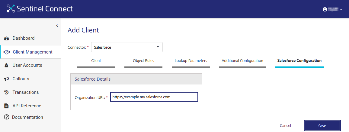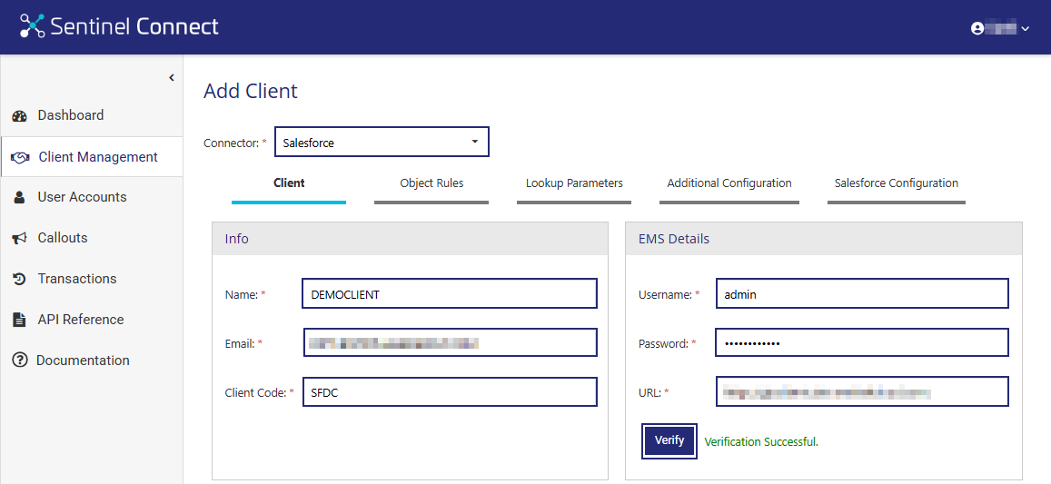 In this step, you set up the client (tenant) for the selected connector and configure its connection to your Sentinel EMS instance. Before completing the steps below, review the following Sentinel Connect User Guide topics, which describe the referenced options: