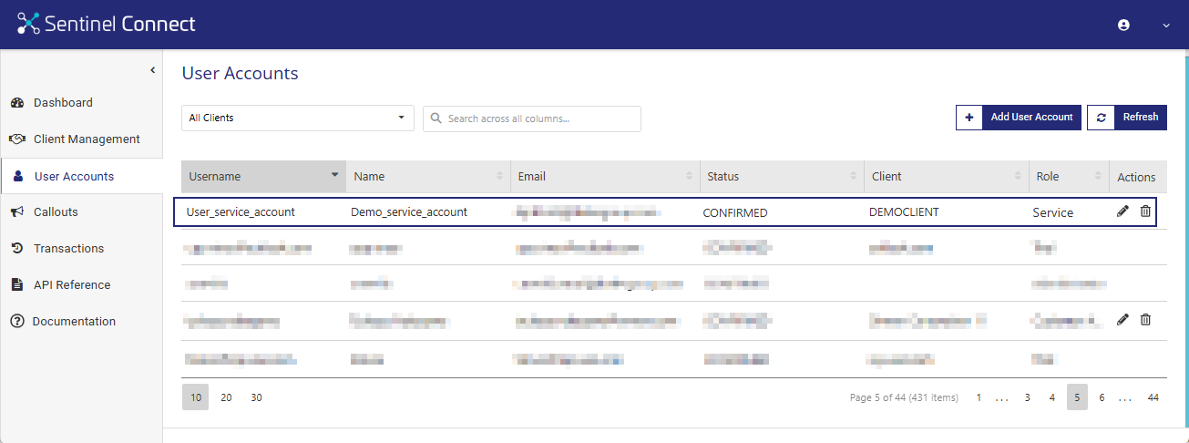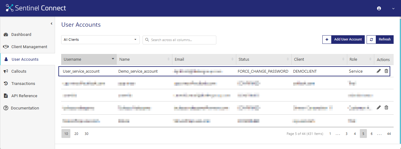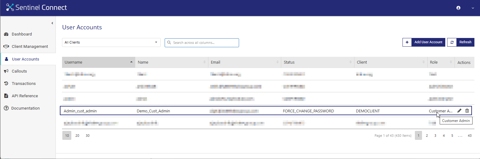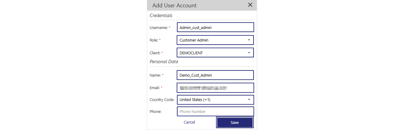 After creating the client (tenant), the next step is to create two user accounts for that client (tenant) — a Customer Administrator Account and a Service Account. Before completing the steps below, review the following Sentinel Connect User Guide topic, which explains the fields and options used when adding user accounts: