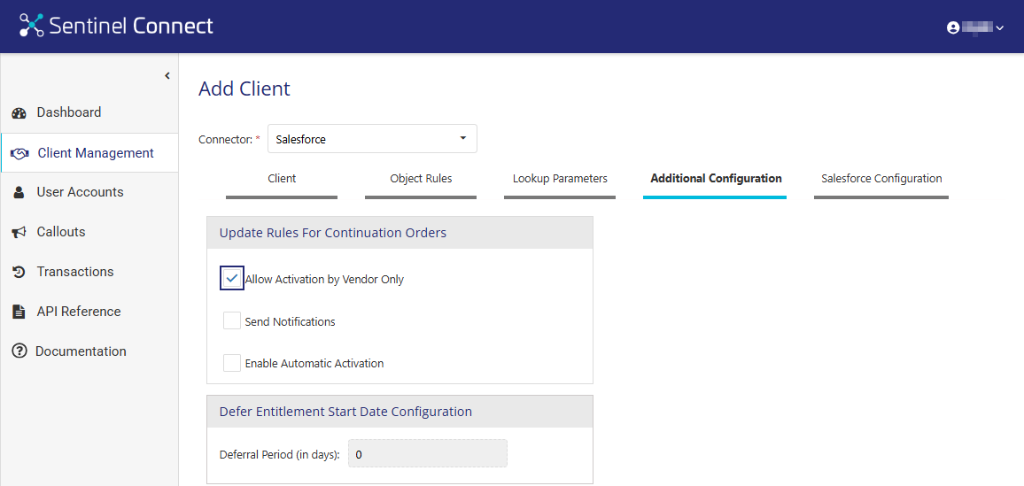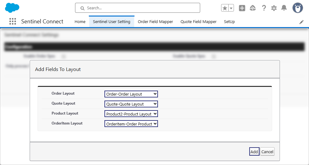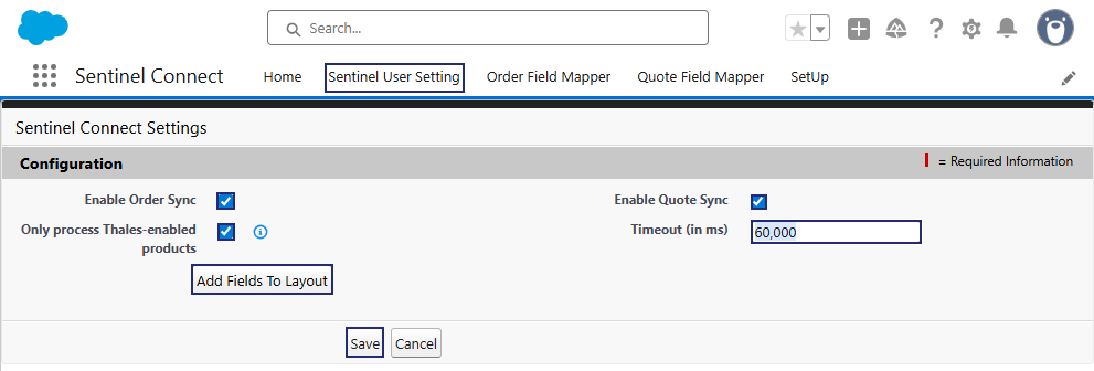 The Salesforce connector includes user-specific settings that govern the synchronization and processing of orders and quotes between Salesforce and Sentinel Connect. Before completing the steps below, review the following Sentinel Connect User Guide topic, which describes the Sentinel User Setting option:
