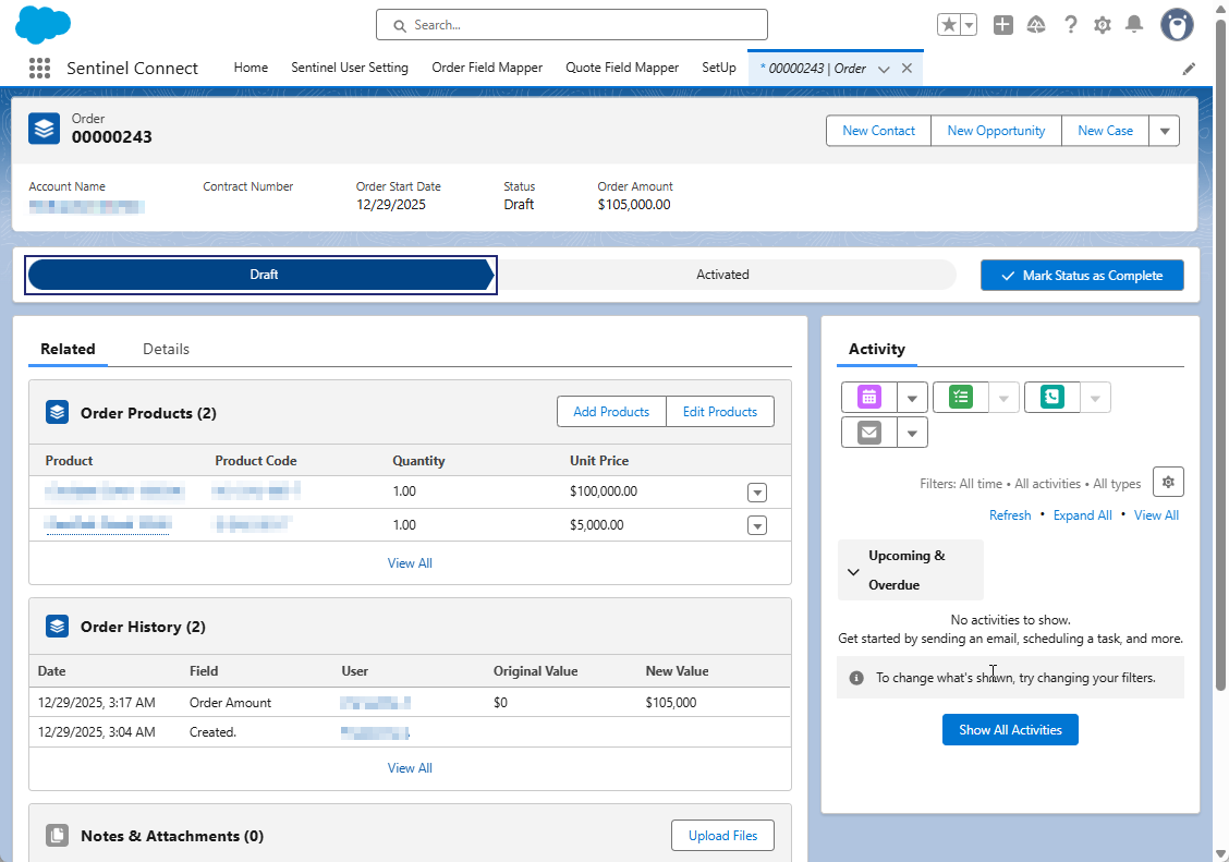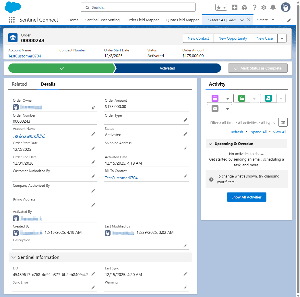 In this step, you process a test order in Salesforce and verify that Sentinel Connect successfully processes the order and synchronizes the corresponding entitlements.