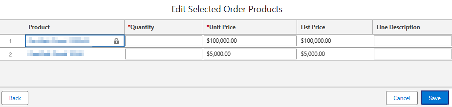 8.In the Edit Selected Order Products screen, specify the Quantity; the Unit Price and List Price are already filled.