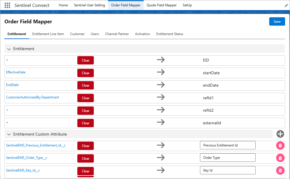 In this step, you define field mappings in Salesforce to control how order data is sent to Sentinel Connect for entitlement processing. Before completing the steps below, review the following Sentinel Connect User Guide topic, which describes how to access the Field Mapper: