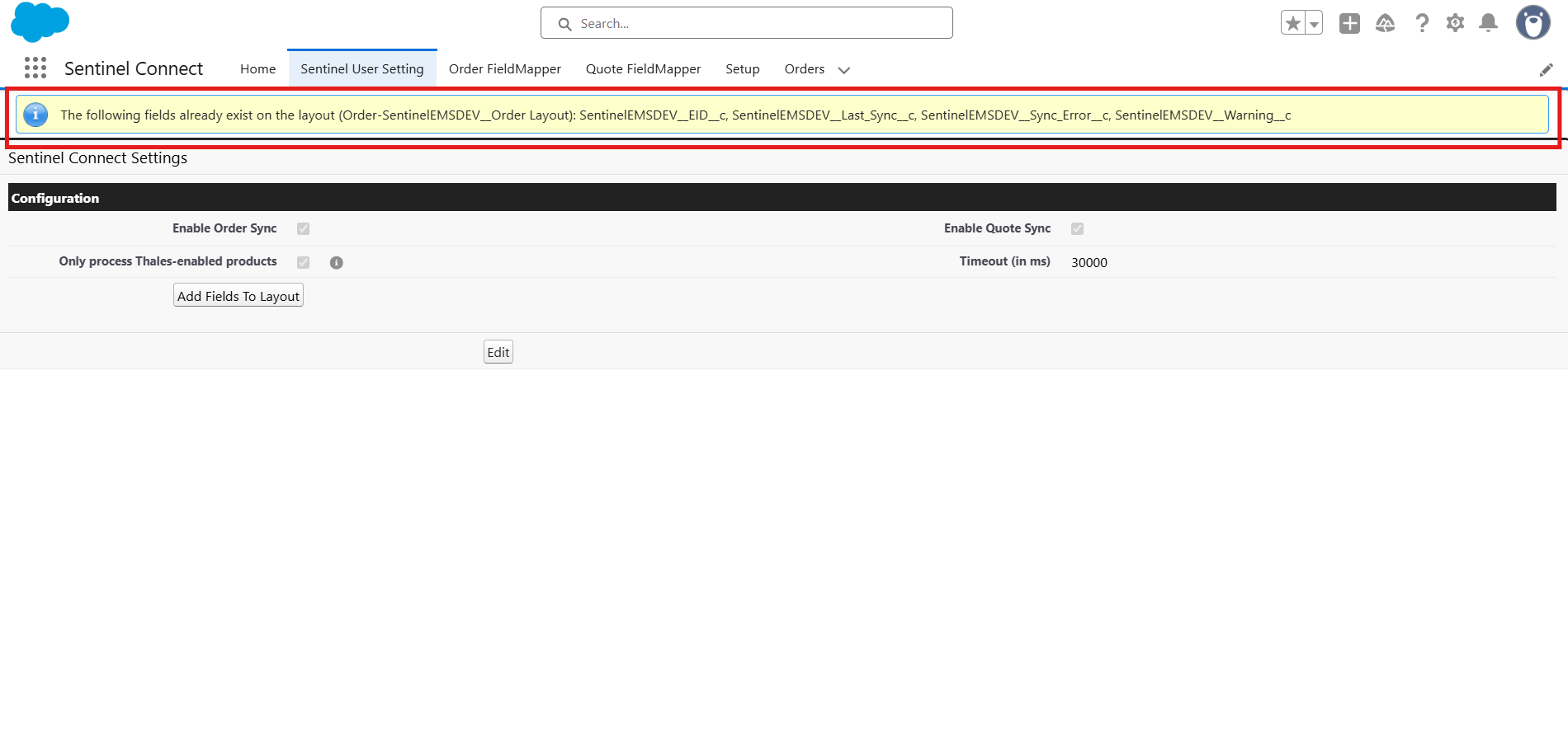 >Add Fields To Layout: The Add Fields To Layout button helps administrators automatically add Sentinel Connect-required custom fields to selected Salesforce object page layouts, without manually editing layouts in Salesforce Setup. This ensures that all required Sentinel Connect fields are consistently available on relevant Salesforce objects used by the connector.