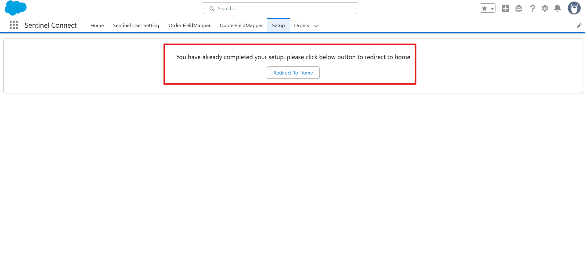 The Setup tab performs a one-time configuration required to enable Sentinel Connect functionality on Salesforce Quotes. Once completed, the setup cannot be re-run.