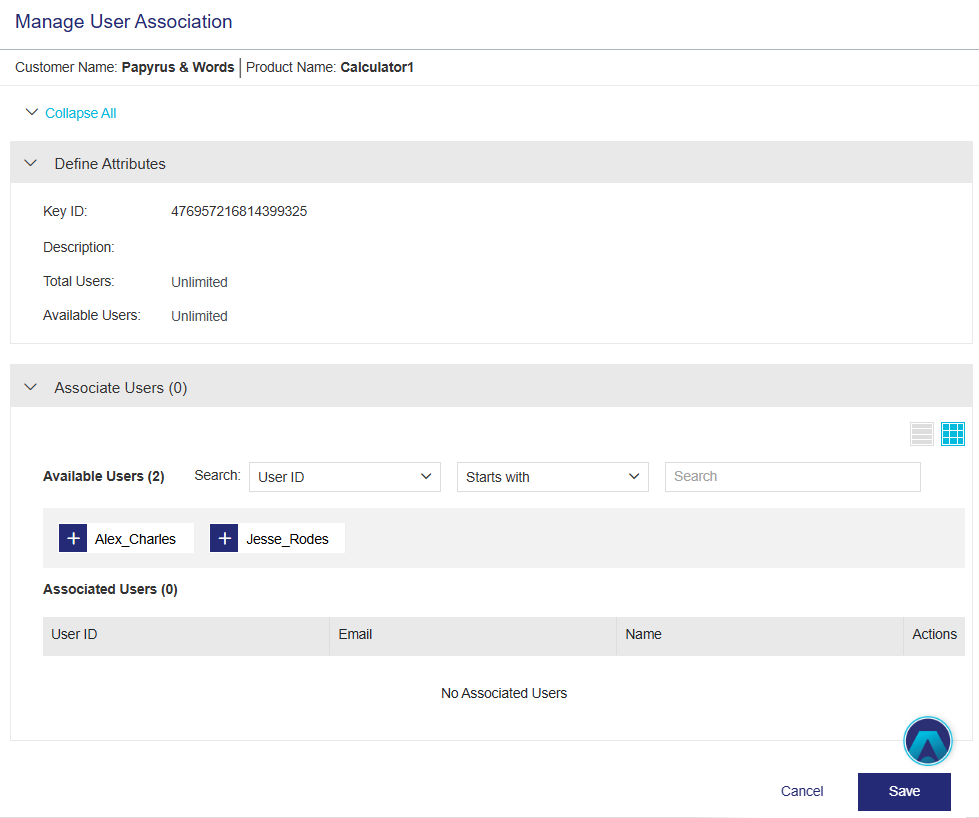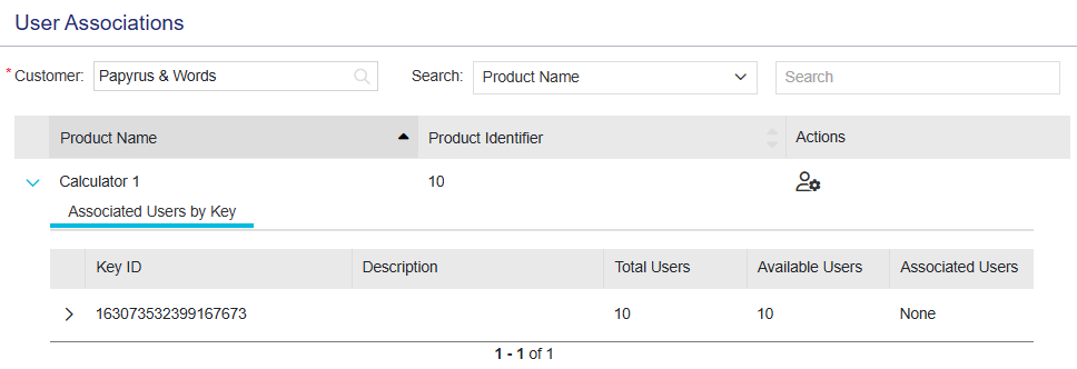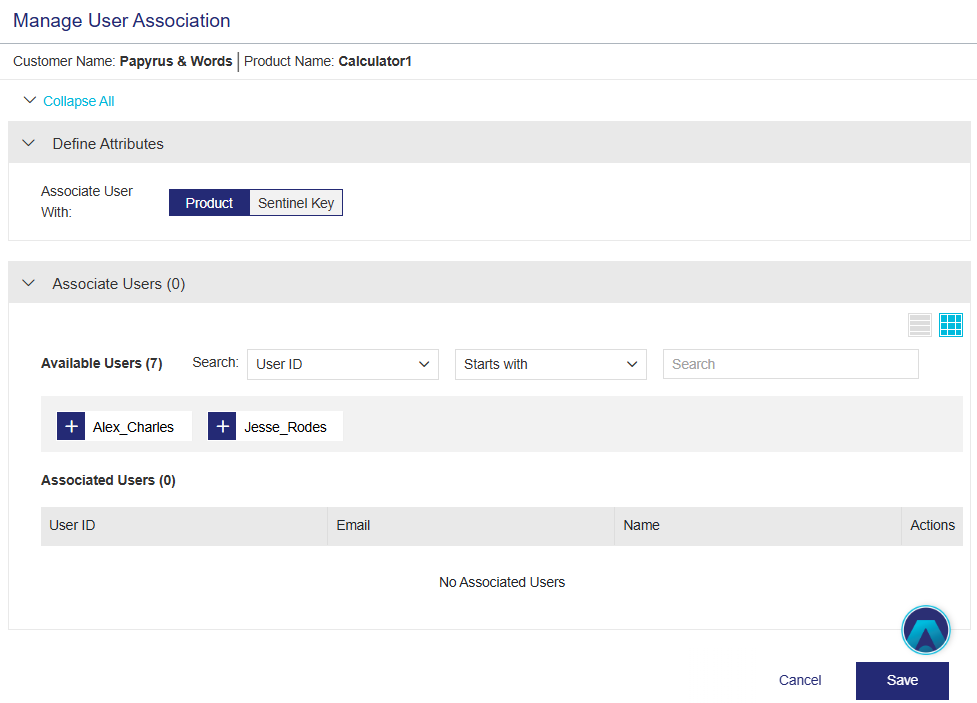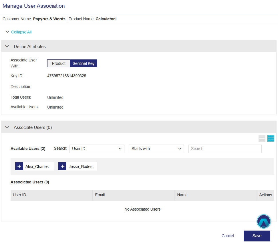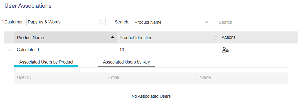 Enables you to associate or disassociate a customer's users with a product or Sentinel key. For details, see Managing User Associations. |