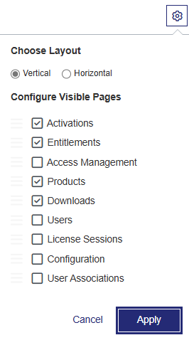 (Visible only if you are logged in as a vendor administrator.) Configures the visibility and sorting of the grid columns in the Entitlements, Downloads, and Activations pages. For instructions on grid configuration, see |