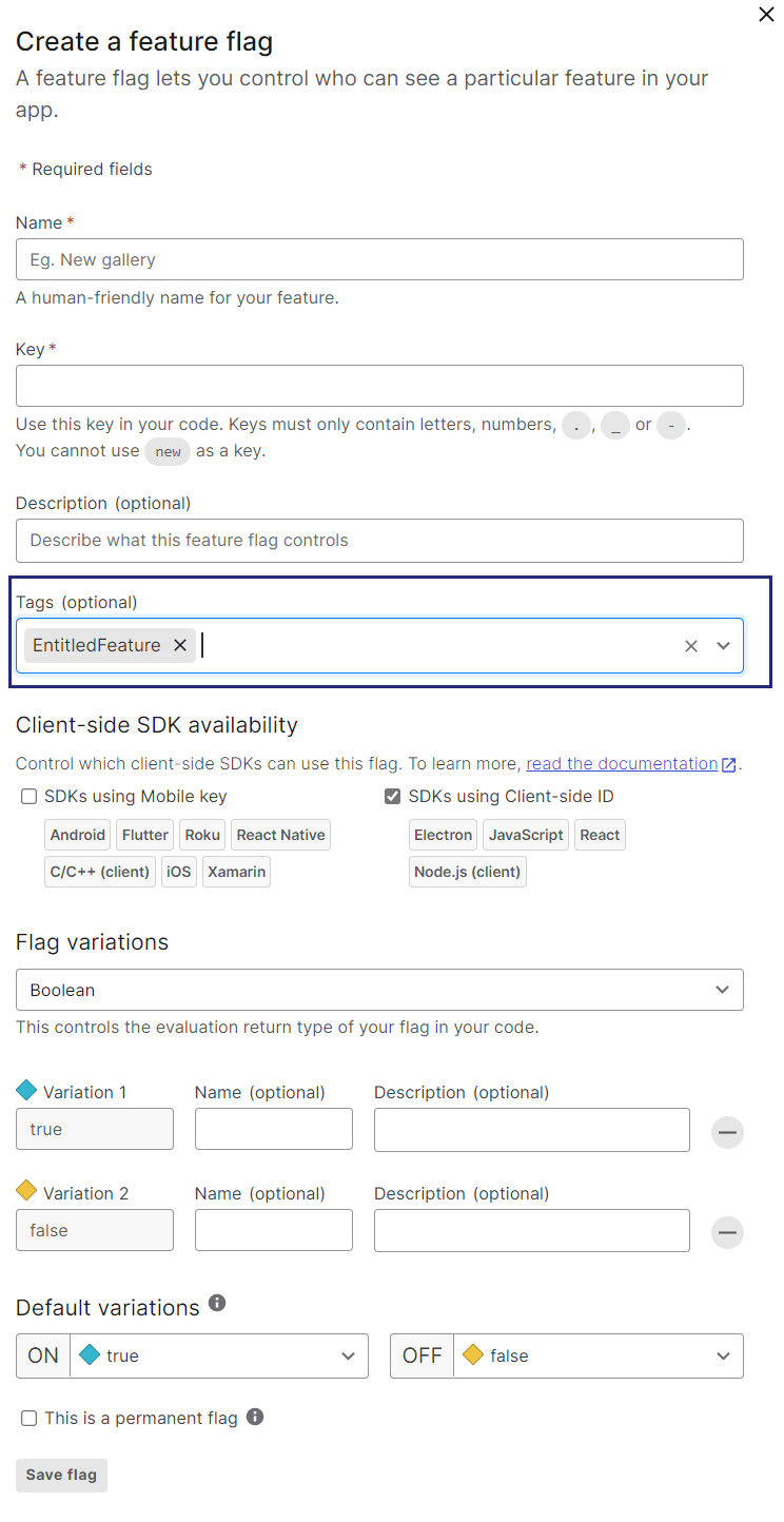 •In LaunchDarkly, set the Tags value to EntitledFeature. This tag is used to filter out commercial features that need to be created in Sentinel EMS.