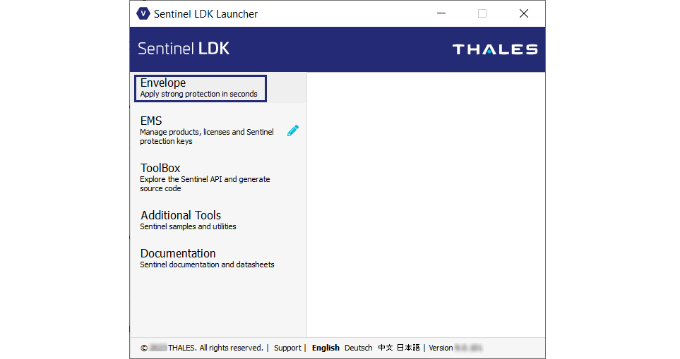 2.Click Envelope to launch Sentinel LDK Envelope. Sentinel LDK Envelope opens to enable you to protect your application or service.