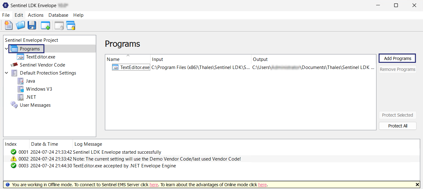 In this section, you are using Sentinel Envelope to protect the TextEditor application.