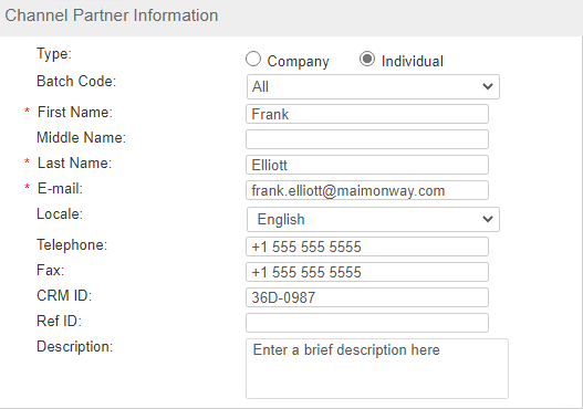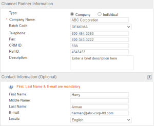 >First Name, Middle Name, and Last Name: Enter a unique name for the channel partner (case-sensitive). >Contact E-mail: Enter the e-mail address of the Channel Partner in the field. >Locale: Select the preferred language for the Channel Partner. >Telephone and Fax: Enter telephone and fax numbers. >CRM ID and Ref ID: Enter values for CRM ID and Ref ID if required. |