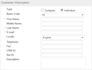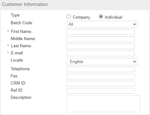 >First Name, Middle Name, and Last Name: Enter a name for the Customer. >E-mail: Enter the e-mail address of the Customer in the field. >Locale: Select the preferred language for the Customer. >Batch Code: (Optional) Associate a Batch Code with the Customer. The Customer will be available for Entitlements in the same Batch Code. >Telephone and Fax: Enter telephone and fax numbers. >CRM ID and Ref ID: Enter values for CRM ID and Ref ID if required. |