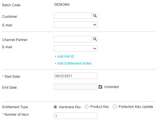 5.(Optional) Click the Add Ref ID link to add reference IDs. In the Ref ID 1 and Ref ID 2 boxes, enter something that identifies the Entitlement in another system, such as, the order code in your company's ERP system.