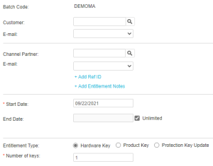 >A batch code other than DEMOMA is present in the Sentinel LDK-EMS database, the master key is connected, and the Channel Partner module is available in the master key.