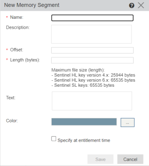 Enter the size of the memory segment in bytes. Supported value range: >Sentinel HL key version 4.x keys: 0-25944 >Sentinel HL key version 6.x keys: 0-65535 >Sentinel SL keys: 0-65535 |