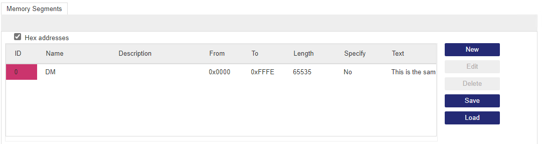 e. Click Save to create the memory segment. The newly defined area is displayed in the lower section of the Memory Segments tab.