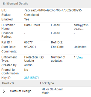 Searches by the Sentinel protection key ID. Only entitlements with a Completed or Acknowledged status are displayed. |