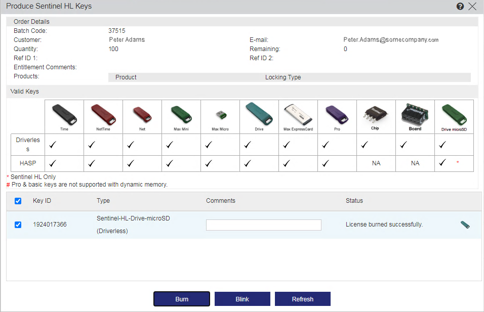 5.Select a key and click Burn. The order is written to the Sentinel HL key and the production totals (Quantity and Remaining) are updated. If a Sentinel HL key has pending orders (for example, if there are already V2C files for the key that have not been applied), the pending orders are overwritten.