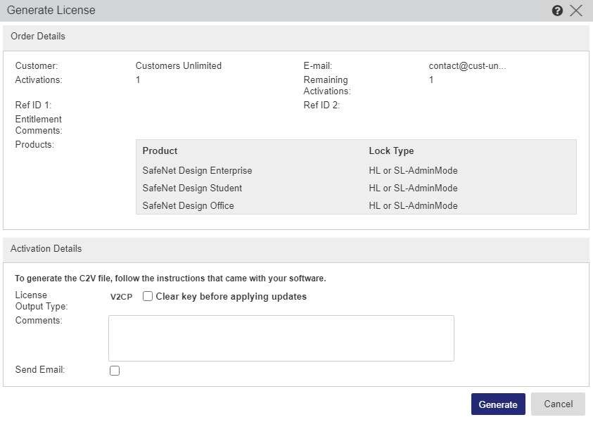 5.Click Generate. A V2C or V2CP file is generated. This file can be used with the RUS utility (Sentinel Remote Update System) to apply the license on the end user machine.