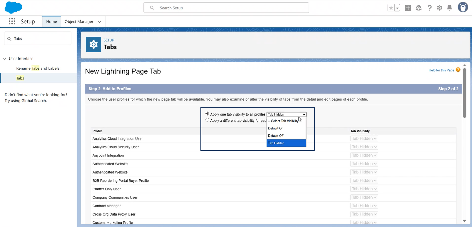 | Apply one tab visibility to all profiles | Tab Hidden |