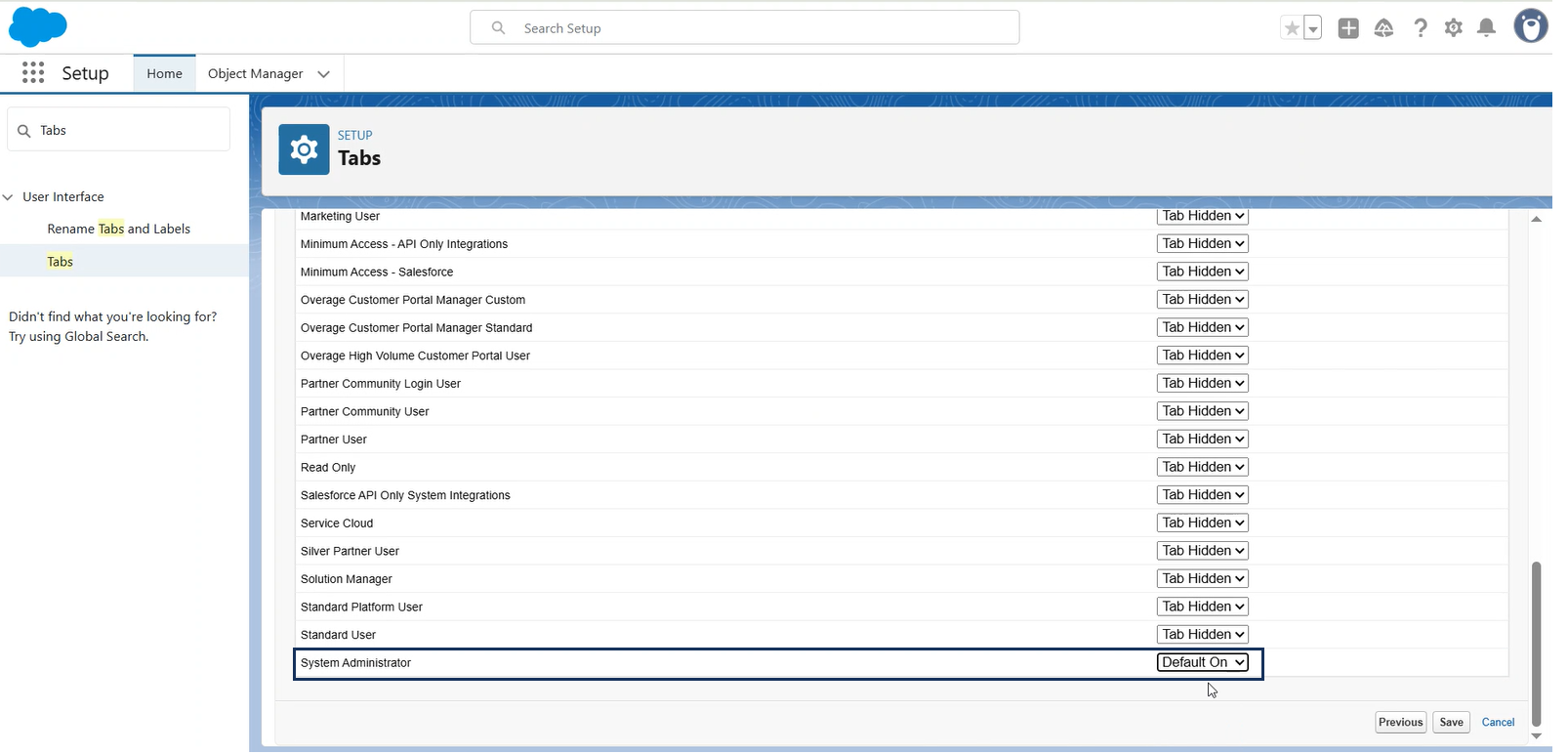2.In the Setup page, under the Quick Find box, search for Tabs.