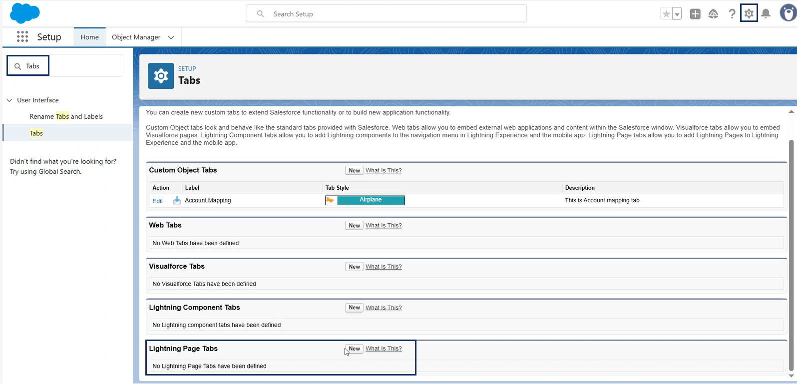 3.In the Tabs page, look for Lightning Page Tabs. Click New.