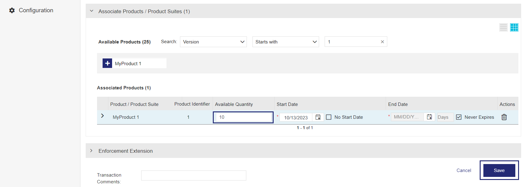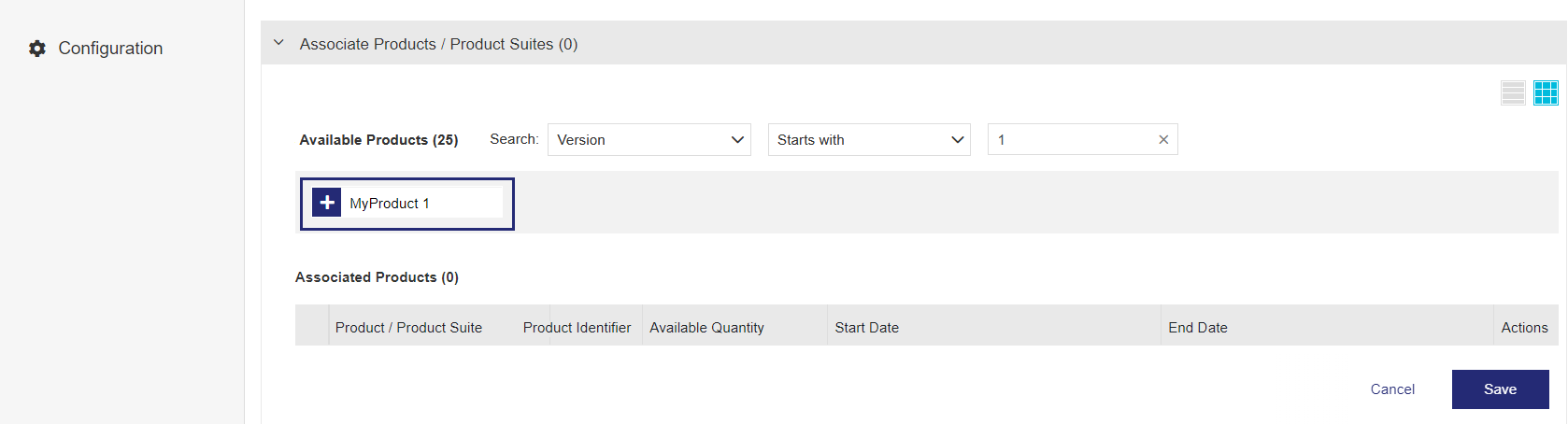5.In the Associate Products / Product Suites pane, under Available Products, click the product you created to add it to the Associated Products / Product Suites section.