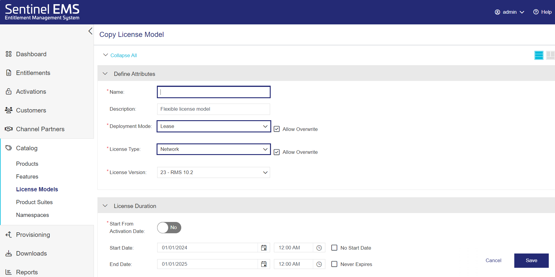 4.In the Copy License Model page, in the Name field, enter any license model name, for example, MyLicense.