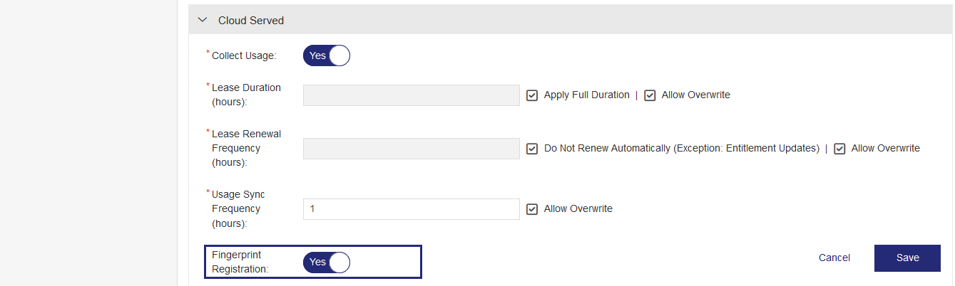 8.Under the Cloud Served section, toggle Fingerprint Registration to No. This specifies that the machine registration is not required to consume the entitlement.