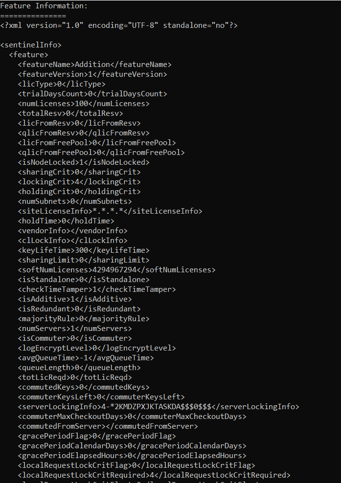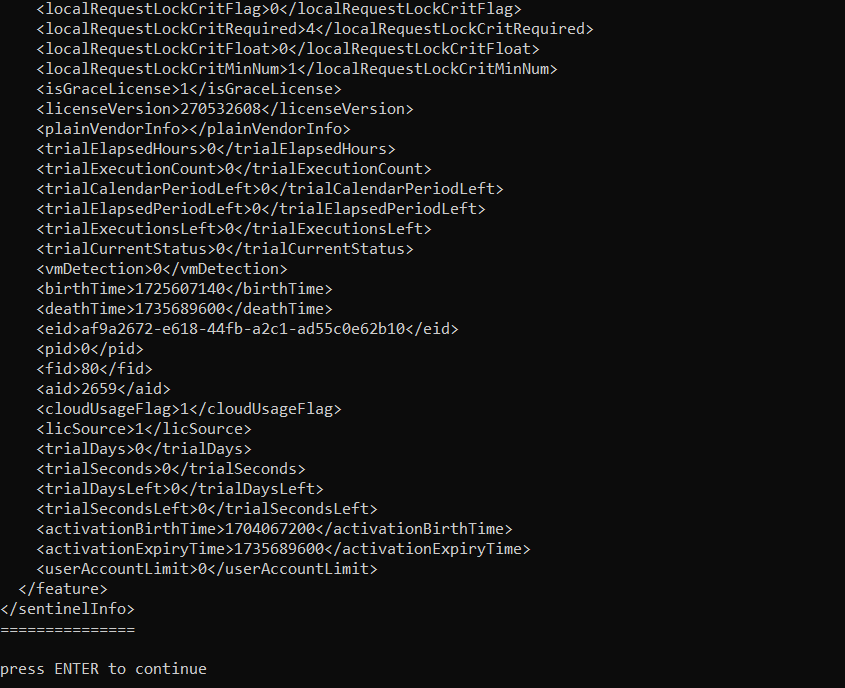 4.Press Enter. The session information is displayed, which is the information for the current license session. Note that a successful license request creates a license session. For example, <tokensInUse> is shown as 1 because one license has been used with the call to the login API.