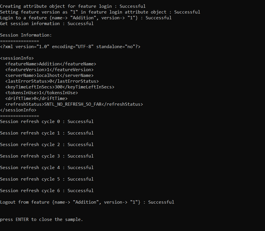 3.Press Enter to call the login API. This requests licenses for the feature you created.