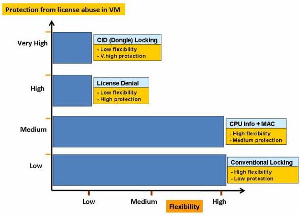 The graph below compares the various locking options on the scale of flexibility versus protection against license abuse: